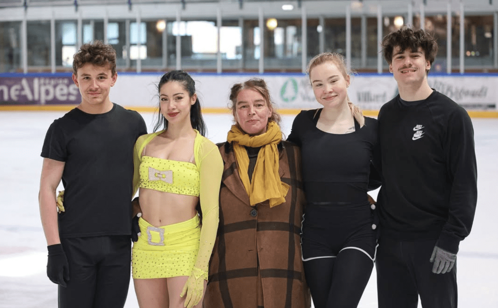 Karine Arribert (center) with her teams preparing for Skate America (photo by Antonin Albert via Villard de Lans Instagram)